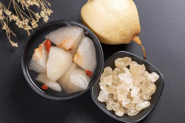 雪梨味甘性寒,含苹果酸、柠檬酸、维生素B1、B2、C、胡萝卜素等,主要烹饪工艺是炖。梨润肺清热,生津止渴,与冰糖同用,增强润沛止咳作用,