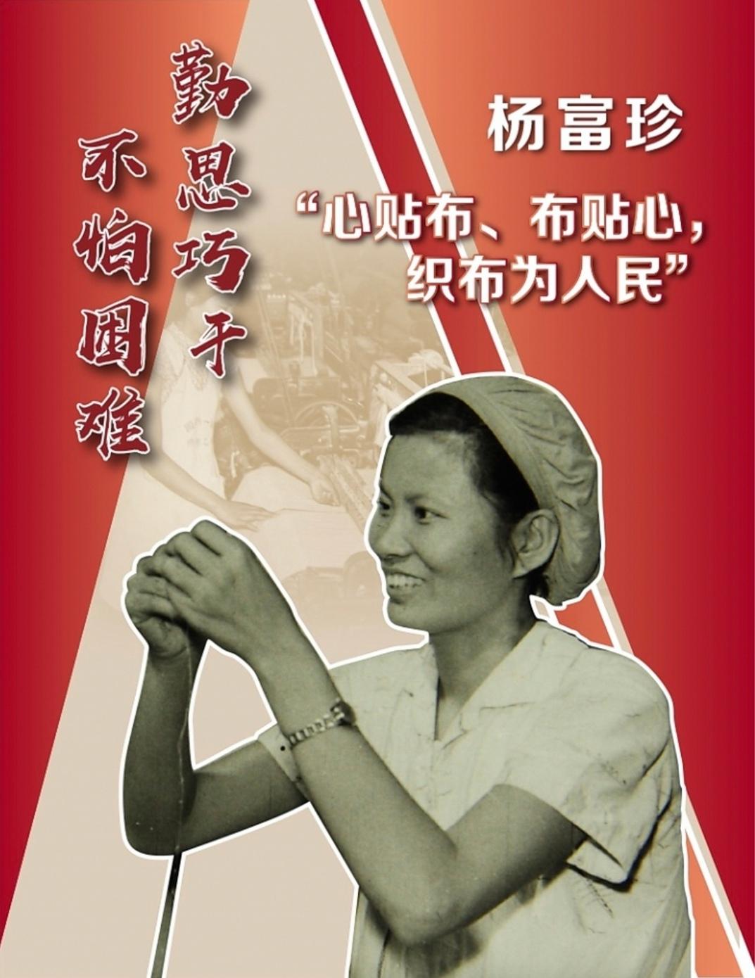 杨富珍当年为了确保织布不出次品,苦练成每分钟打40多个结头的绝活,学成左右开弓的刮盘方法,创造了89个月无次布的行业奇迹,带领织布班组创造高速生产操作法,十年如一日保持优质高产。她先后七次被评为全国和市劳动模范,两次获评全国先进生产者、全国三八红旗手。离休之后,她依然发挥余热,心系教育祖国下一代,积极投身公益工作和社会活动。