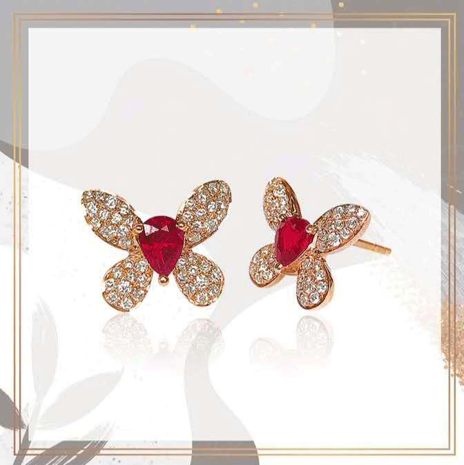 在选对合心合意的款式的同时,饰品的寓意也非常重要,在珠宝设计师的眼中,蝴蝶是艺术的精灵,蝴蝶同音“福迭”,喻示幸福如期而至,象征佩戴之人的福气会源源不断的到来。老凤祥以蝴蝶作为设计灵感,将蝴蝶的婉约和轻灵与靓丽的红宝石相结合,镶嵌18K金和多颗圆形切割钻石,展现蝴蝶律动的翅膀。红宝石热情大方,配以蝴蝶的婉约可人,深受女性吸引,萦绕在其耳畔,非常适合优雅妩媚的女性。