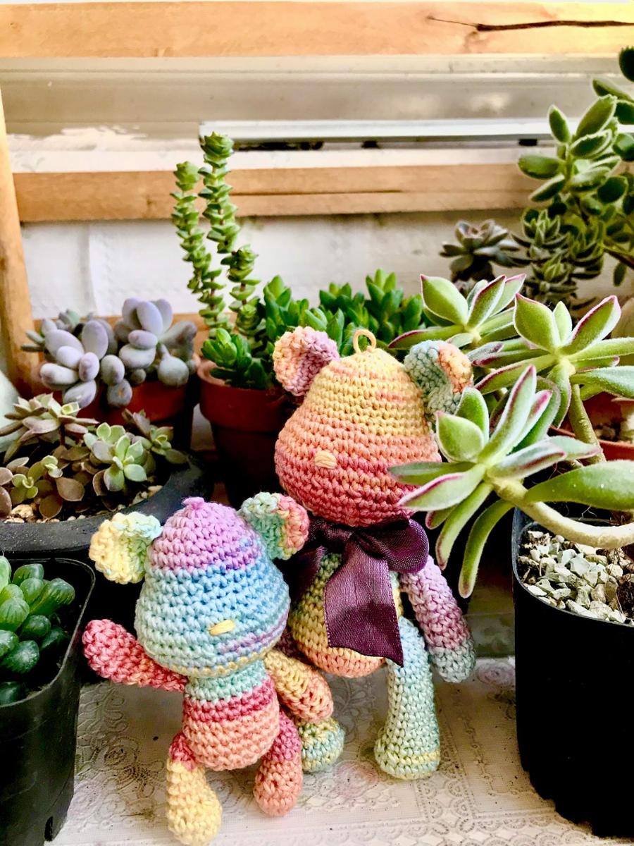 完成后,标准款小熊大约高15厘米左右,迷你款大约高10厘米左右。萌萌的造型,加上渐变的色彩、钩编的质感,作为小礼物送人,或者当作挂饰,都十分精致可爱。