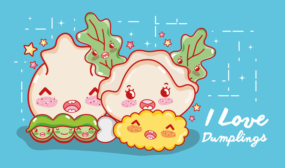 在擀好的饺子皮中放入15克饺子馅,包成饱满的元宝型。用各色面团分别做成小部件,用水粘牢,按自己的想象刻画细节,完成所有卡通的造型。