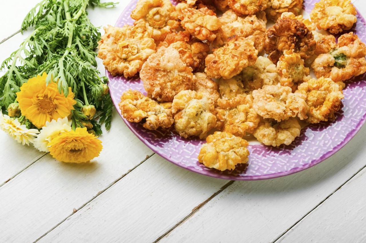 制作方法:1)将菊花在清水中泡15分钟,加入白矾少许去异味;2)面粉中打入蛋清调成面糊,依据个人口味加入调味;3)将菊花放入面糊中滚揉均匀;4)油温45-55°在锅中旋转炸制,炸透即可。