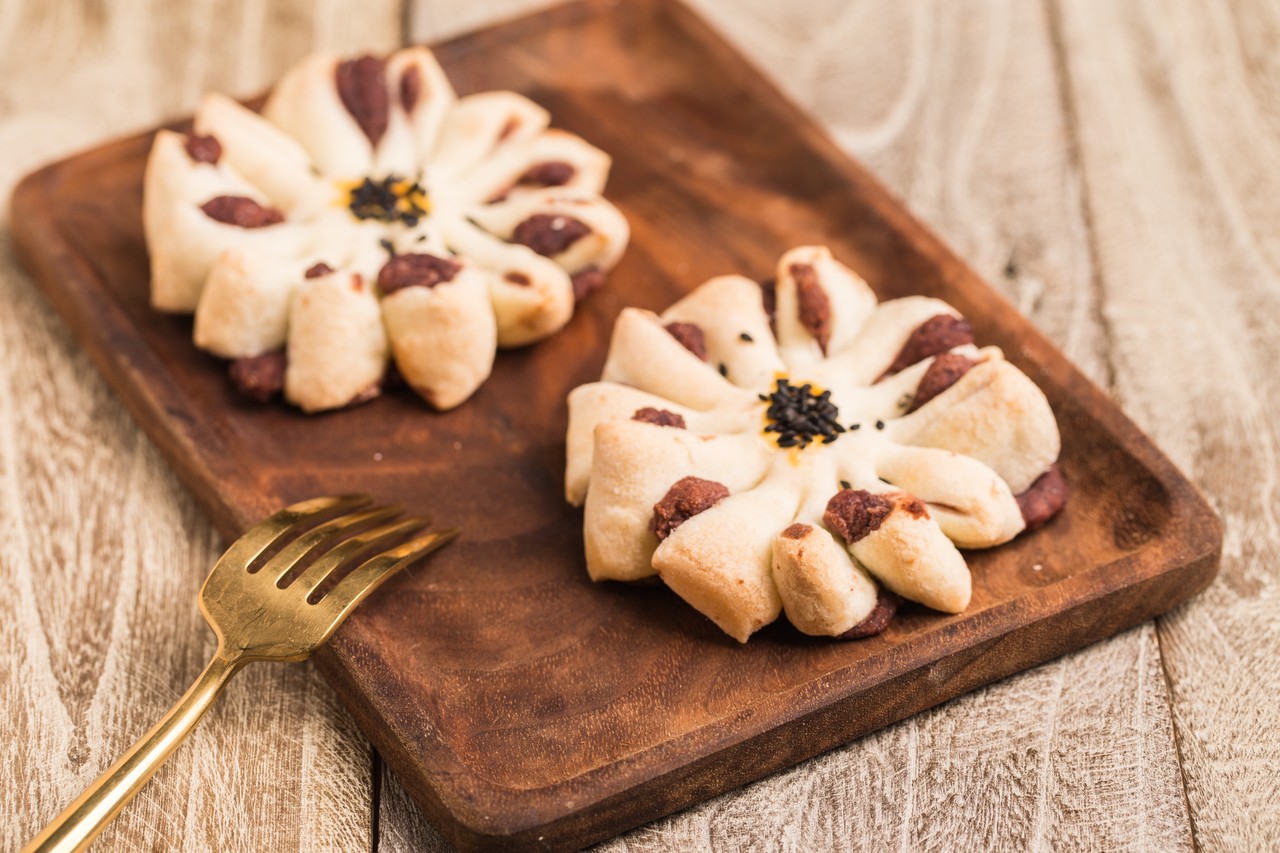 制作方法:1)黄油在开水中烫融化加入糖粉;2)面粉加入鸡蛋与加入糖的黄油搅拌均匀后揉成面团;3)取大小适中的面团一小块擀成面皮;5)将准备好的豆沙包入面皮中;6)将包好馅的面团按扁切成菊花花瓣状;7)将做好的酥饼放入烤箱,温度180度烤30分钟即可。