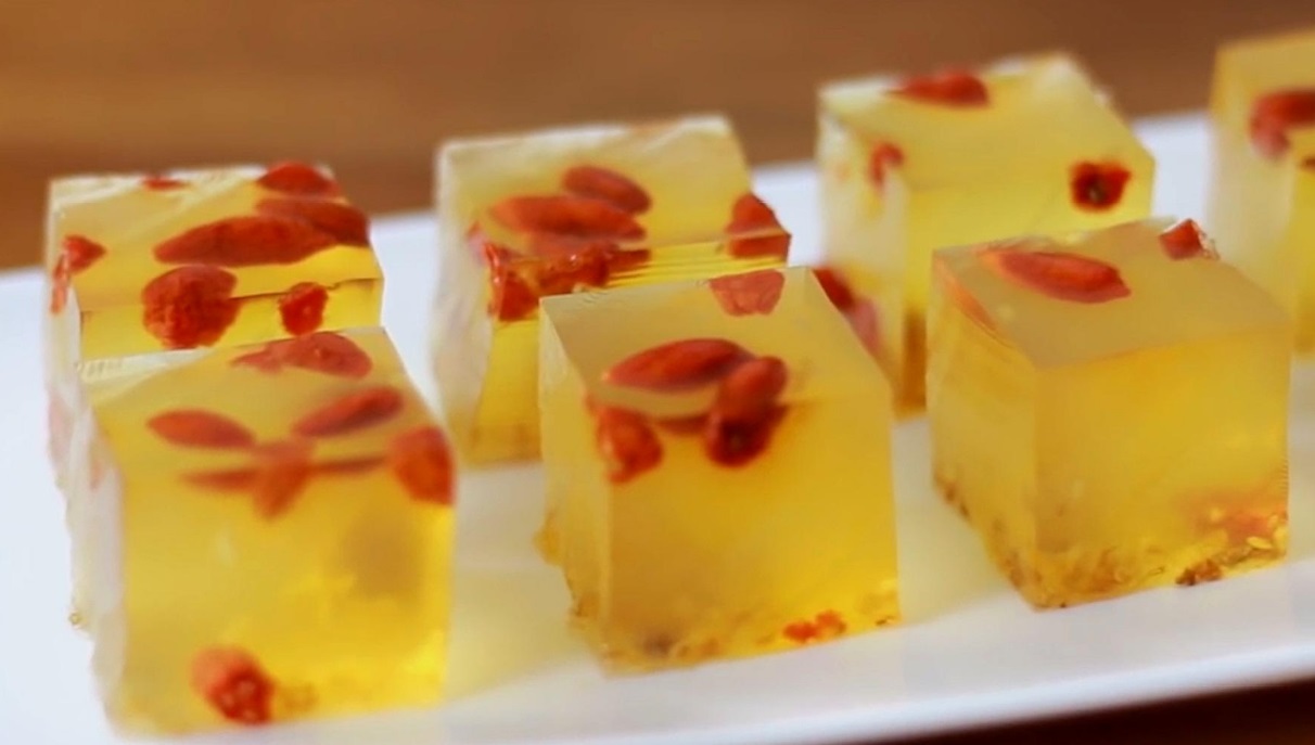 制作方法:1)六杯水加十朵菊花煮沸,用纱布滤掉菊花得菊花水;2)在菊花水里加入十克冰糖,倒入马蹄粉,一边搅拌一边加热,煮沸即熄火;3)把煮好的水倒入模子,加入枸杞碎,放凉倒出即可。
