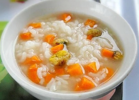 制作方法:1)菊花用水泡发、胡萝卜洗净、切小粒;2)大米洗净入锅加适量水煮开,小火熬煮10分钟;3)倒入胡萝卜,大火煮开,小火熬煮15分钟;4)加入菊花,煮5分钟,随个人口味加入调味即可。
