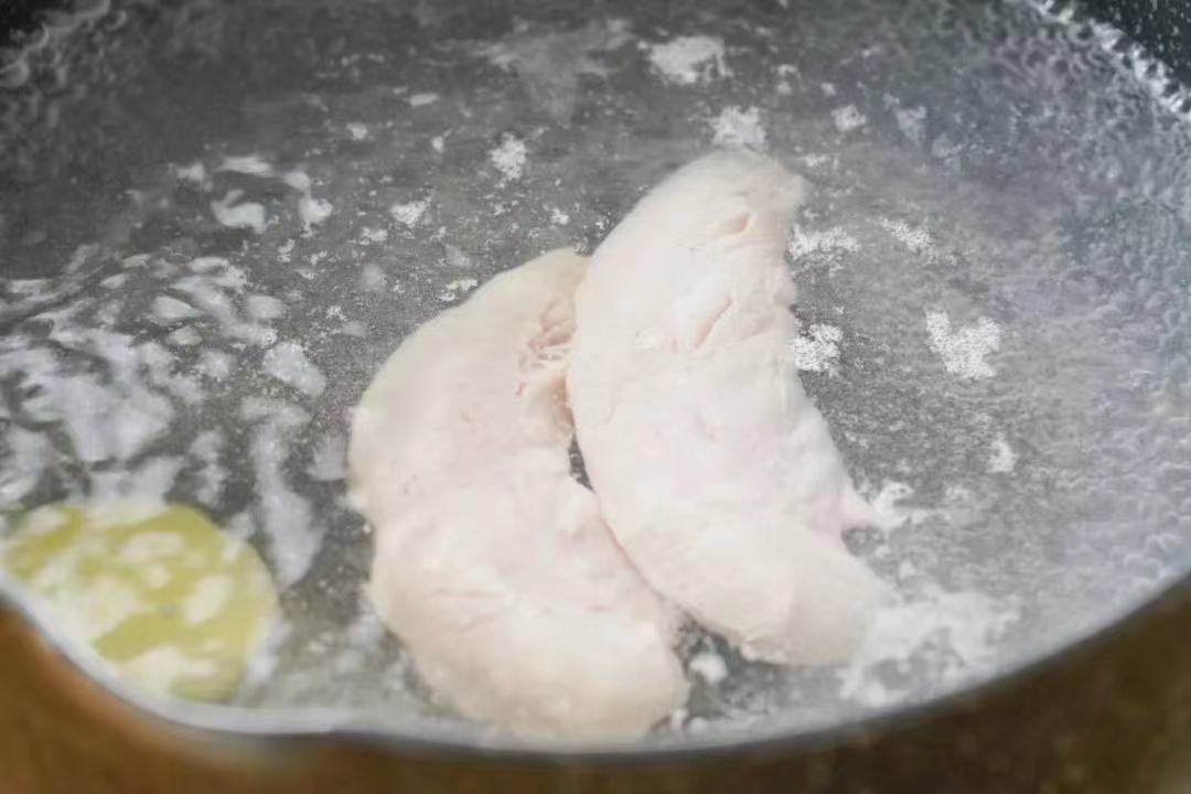 2.锅中加水煮沸后,放入2份鸡胸肉,加入2片生姜片和1勺料酒,一起煮5分钟后捞出,冷却后撕成鸡丝,备用。