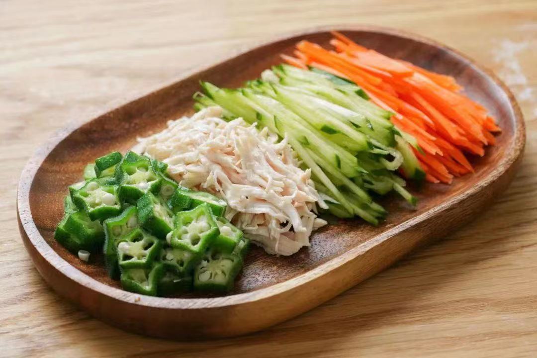 3.半根胡萝卜洗净削皮切细丝,3根秋葵用盐搓洗干净,依次用沸水焯1分钟,捞出过凉水。将秋葵切片,半根黄瓜洗净切丝,备用。