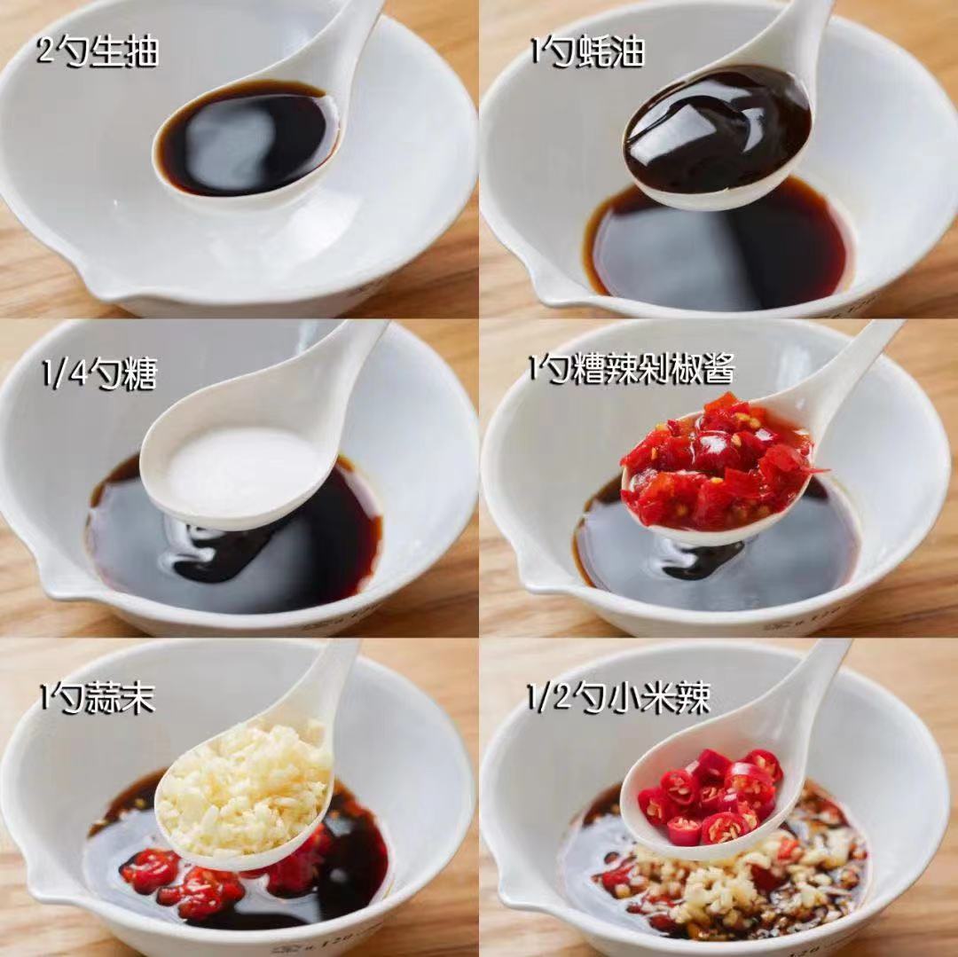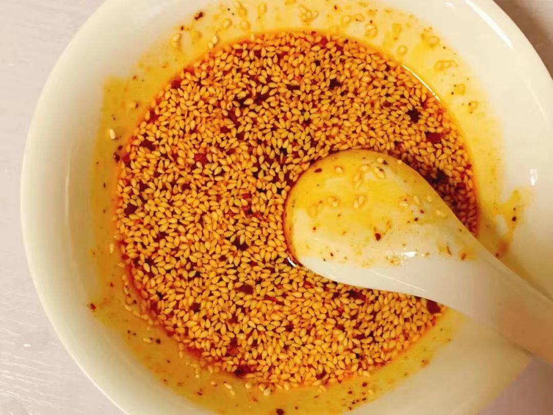 1. 先调个凉拌汁:1勺蒜末+1勺芝麻+1勺细辣椒粉+1勺辣椒干碟,淋上热油。