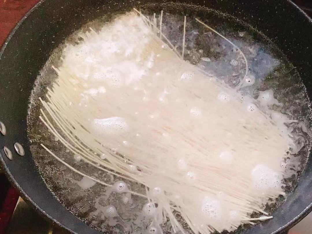 4. 面煮熟捞出过凉水,沥干水分放入碗中。