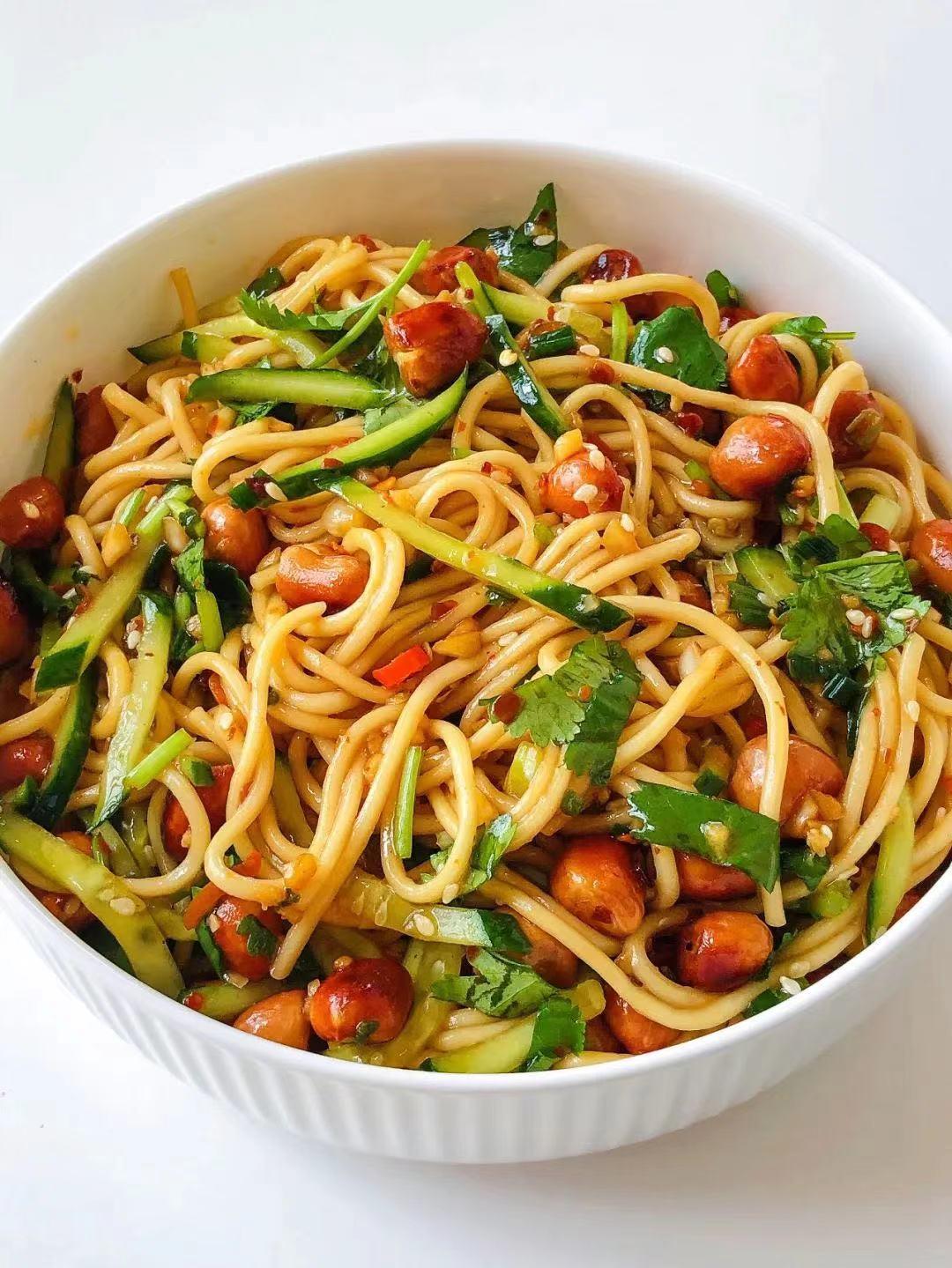 酸酸辣辣的开胃凉拌面,搭配爽口黄瓜丝、酥脆的花生米,5分钟就能感受大口嗦面的幸福!