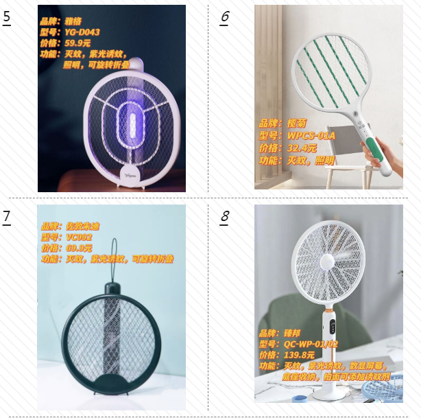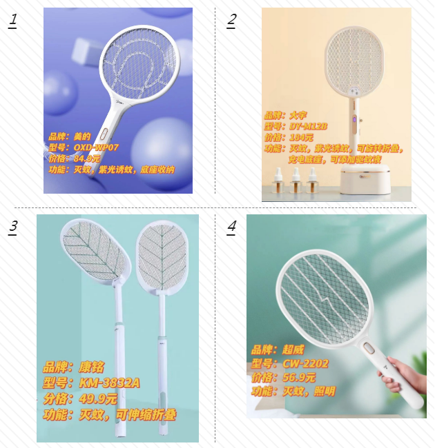 本次比较试验通过主流电商平台渠道购买了10款电蚊拍,价格从32元至184元不等,涵盖了美的、大宇、小米、榄菊、超威、雅格等主流品牌。据调查,70%以上的消费者关注电器安全性和灭蚊效果,因此我们从安全测试和消费体验两方面对样品进行了测试。