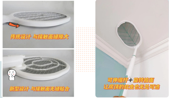 体验发现,有4款样品的拍面与接触面几乎无缝贴合,且都是拍面可旋转设计,相较于传统拍面,这种新型设计更能满足用户的各种拍蚊需求,让静止在墙面或地面的蚊虫无处可逃。康铭电蚊拍将可伸缩拍柄和可旋转拍面结合在一起,让高处的蚊虫也再无藏身之处。