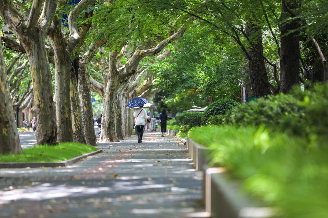 盛夏,是新华路最美的季节,两侧的悬铃木伸展出茂密的枝叶交错在马路的上空,将这条“国宾道”围成一条长长的林荫“隧道”。微风裹着阳光在地面散下点点摇曳的光斑,行走在其中,可以感受到一丝令人舒畅的清凉。