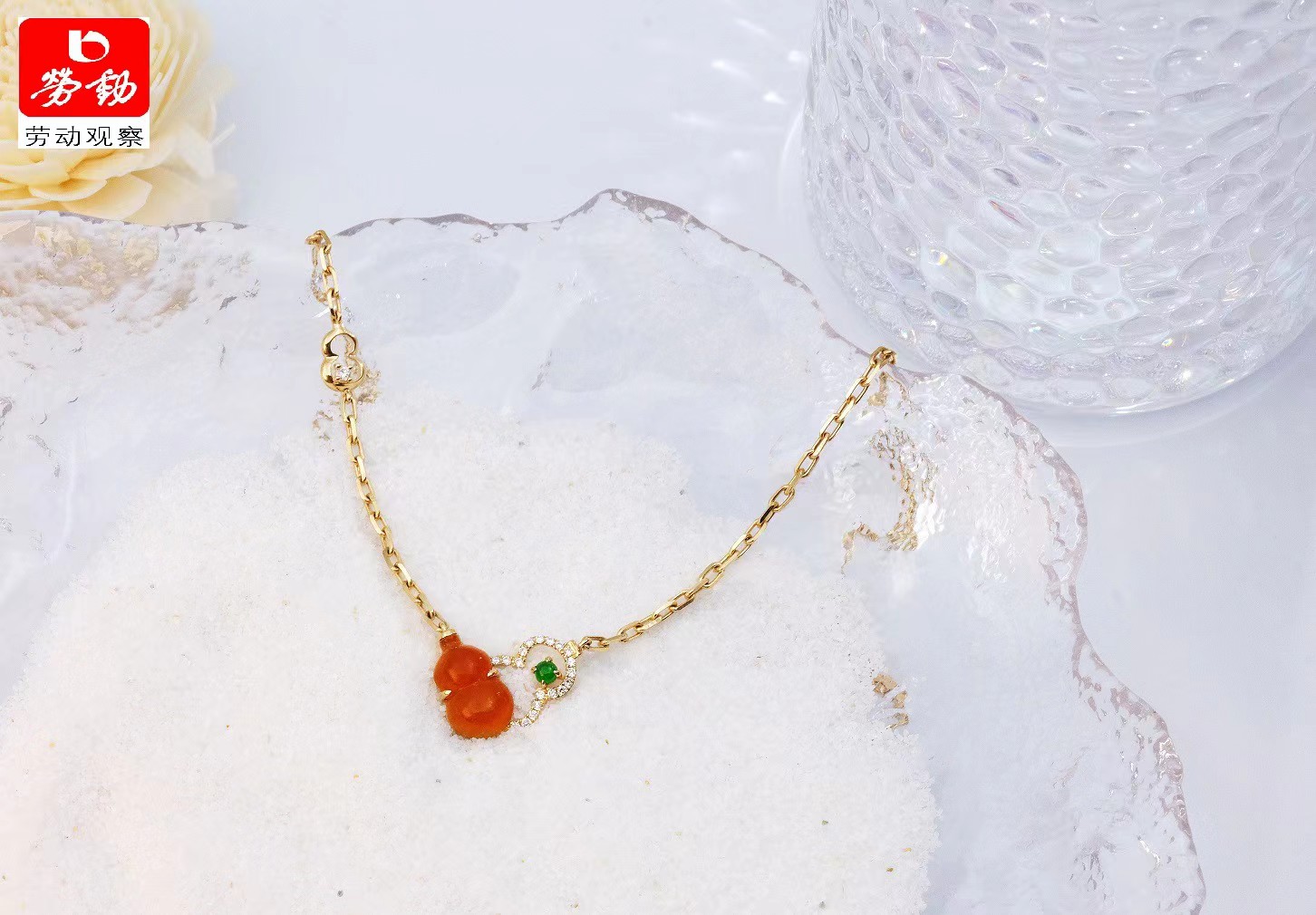 老凤祥红翡绿翠系列首饰有几款,一款以红翡为主角,小颗粒的晶莹绿翡点缀在镂空的K金和钻石构成的金葫芦内,画龙点睛,精巧细致;一款以大小不同的两个红翡绿翠葫芦为AB角,当中以红宝石点缀,端庄秀气;另一款则是红翡为唯一主角,两条金色的挂链搭配小钻石延伸线条感,活泼灵动。