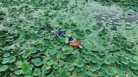 我们也体验了一下这彩色的平台舟,发现确实如工作人员所说,平台舟比较平稳,简易的操作对新手也十分友好。乘坐着小小的游船,穿梭于荷花莲叶之间,仿佛炙热的阳光都变得清爽温柔了许多,触手可及的莲花荷叶,让空气中飘来一丝清甜。远处的水面非常清澈,将蓝天白云,莲叶荷花和游客游船倒映在水中。此情此景,令人心旷神怡。