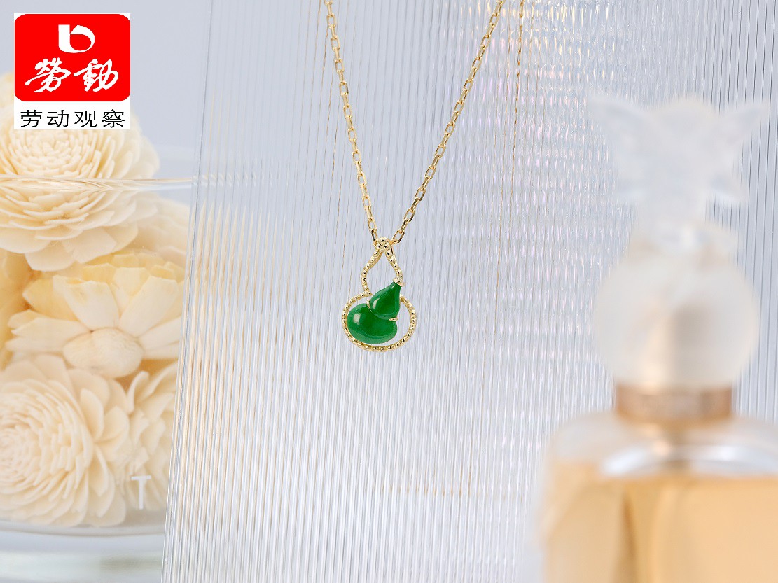 老凤祥在七夕节推出葫芦饰品系列,其中以绿色翡翠和K金、钻石打造的“金玉良缘”葫芦项链,以翡翠葫芦为主角,套于K金镂空的“金葫芦”内,寓意“你中有我”“爱在心中”的含义。
