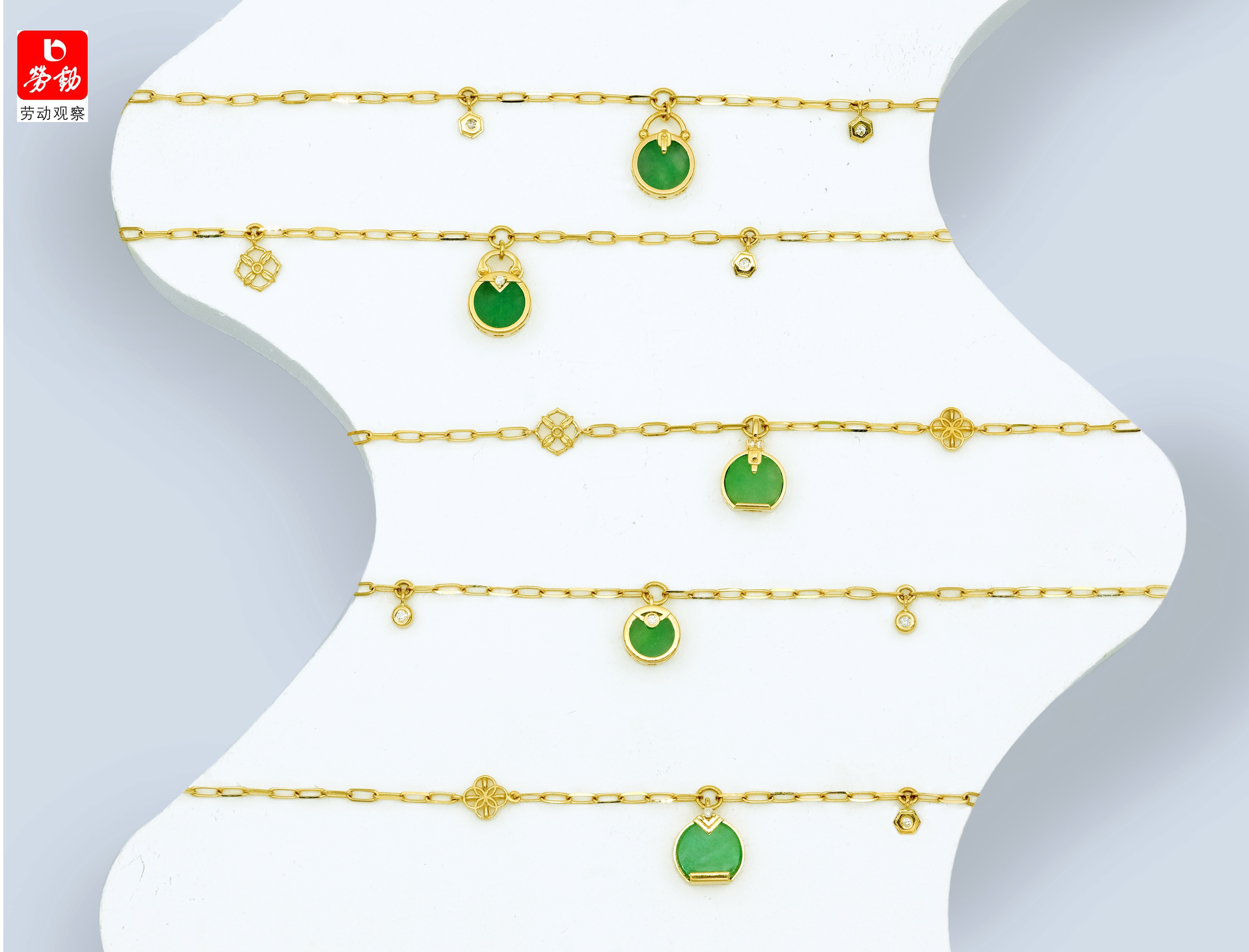包罗万象系列以绿翡为主体,18K金和钻石为辅,纤细的链条上不对称地点缀着小颗钻石和K金花瓣,漂亮有型,轻奢灵动,简洁而不简单,非常好搭配,不管是日常佩戴还是出席重要场合都较合适,随意又知性。