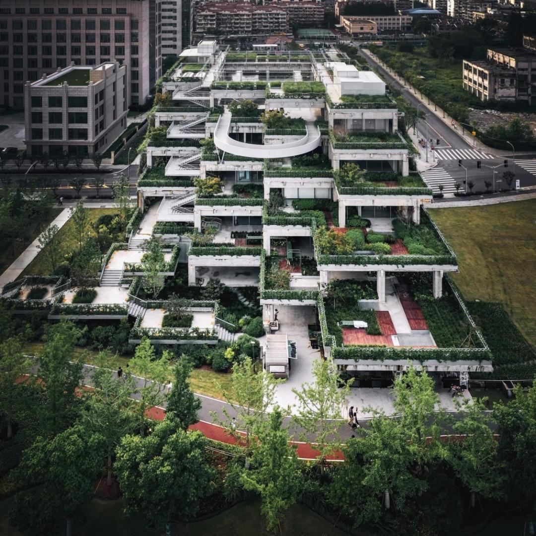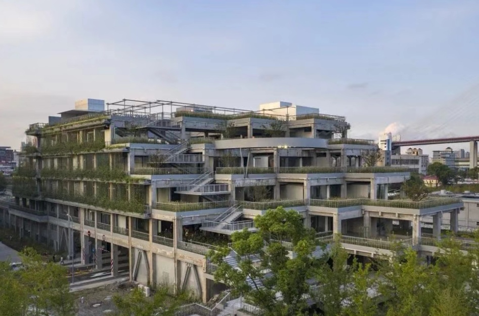 建筑改造后实现了工业建筑向绿色生态建筑的转变,满目苍翠,远望形似绿色的山丘,荣获“上海市既有建筑绿色更新改造评定”金奖。
