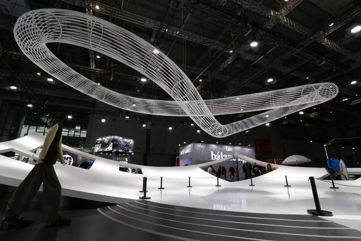 走进5.2H馆Best-Links展台,仿佛置身一个城市、自然、商业与人和谐共生,飘逸着平衡韵律的微观“城市剧场”。率先映入眼帘的是展台中央一个巨大的镂空翘曲界面;其上悬浮着一条轻盈、洁白的立体“∞”无限之环,它以灵动的姿态贯穿这片都市时空的核心界面;在微妙的视觉流动之间,勾勒出动与静临界态的无限可能。“精英聚场”“十字街头”“森林秘境”与“海滩暖阳”,不同主题的时尚艺术场景,在四个开放的方形下沉区域正在等待探索。