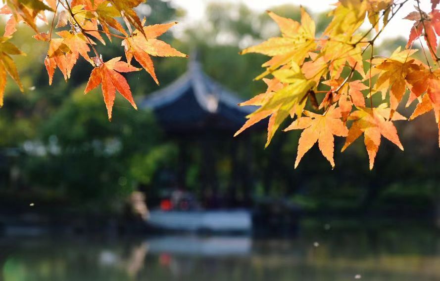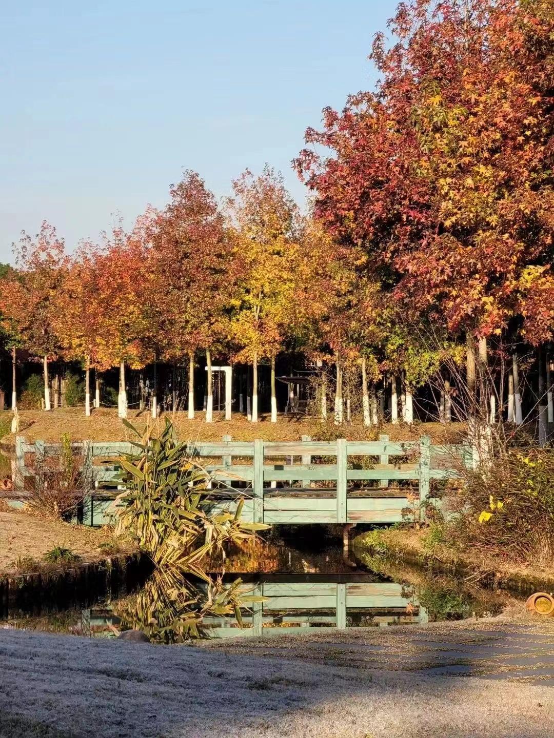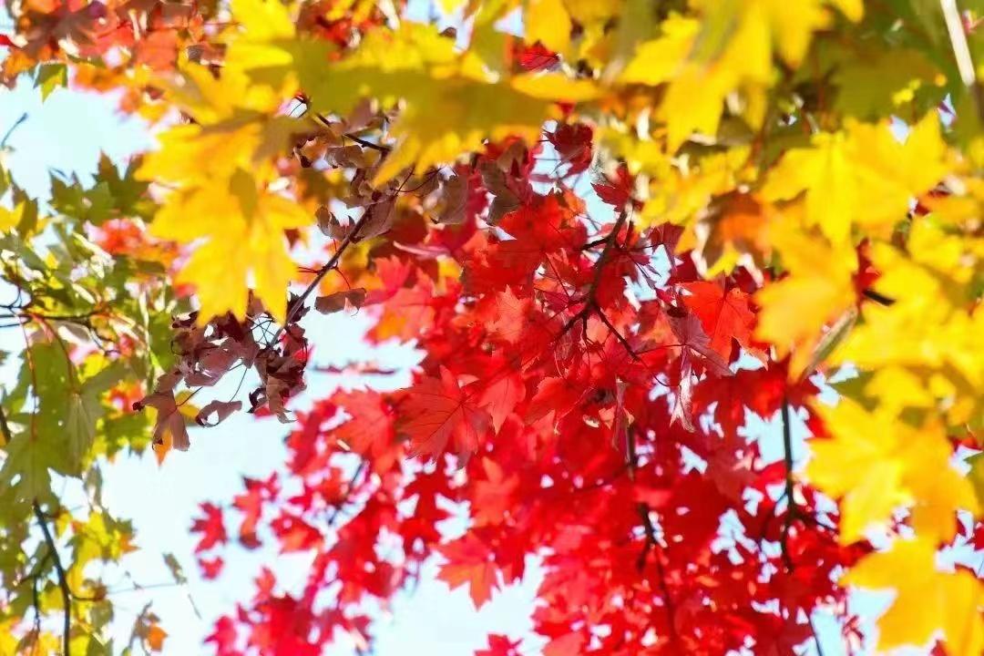 公园里的枫树目前已逐渐开始“燃烧”。如果说水杉是带着活力的橘红和暖黄,那么枫树则是明艳的火红。这种艳丽的红色点缀在尽情舒展身体的枫树上,反而显得越发自由与潇洒。