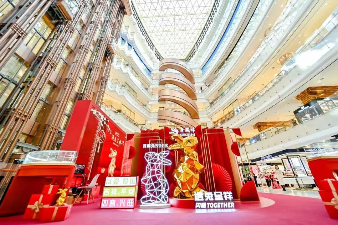 “百福兔”作为“兔nice”系列的新春特别款,首次亮相空降上海新世界大丸百货:一个个闪耀的黄金兔在浓浓的新年氛围中,送上了百年民族品牌诚挚的新春祝福,吸引了众多消费者驻足留影。