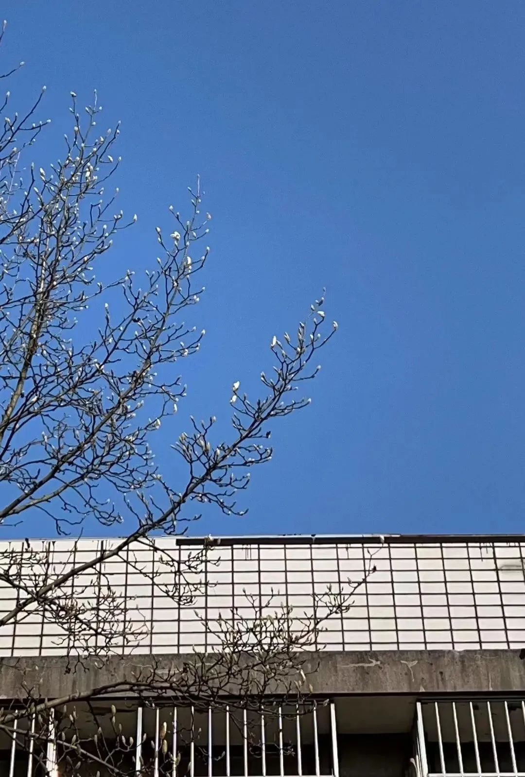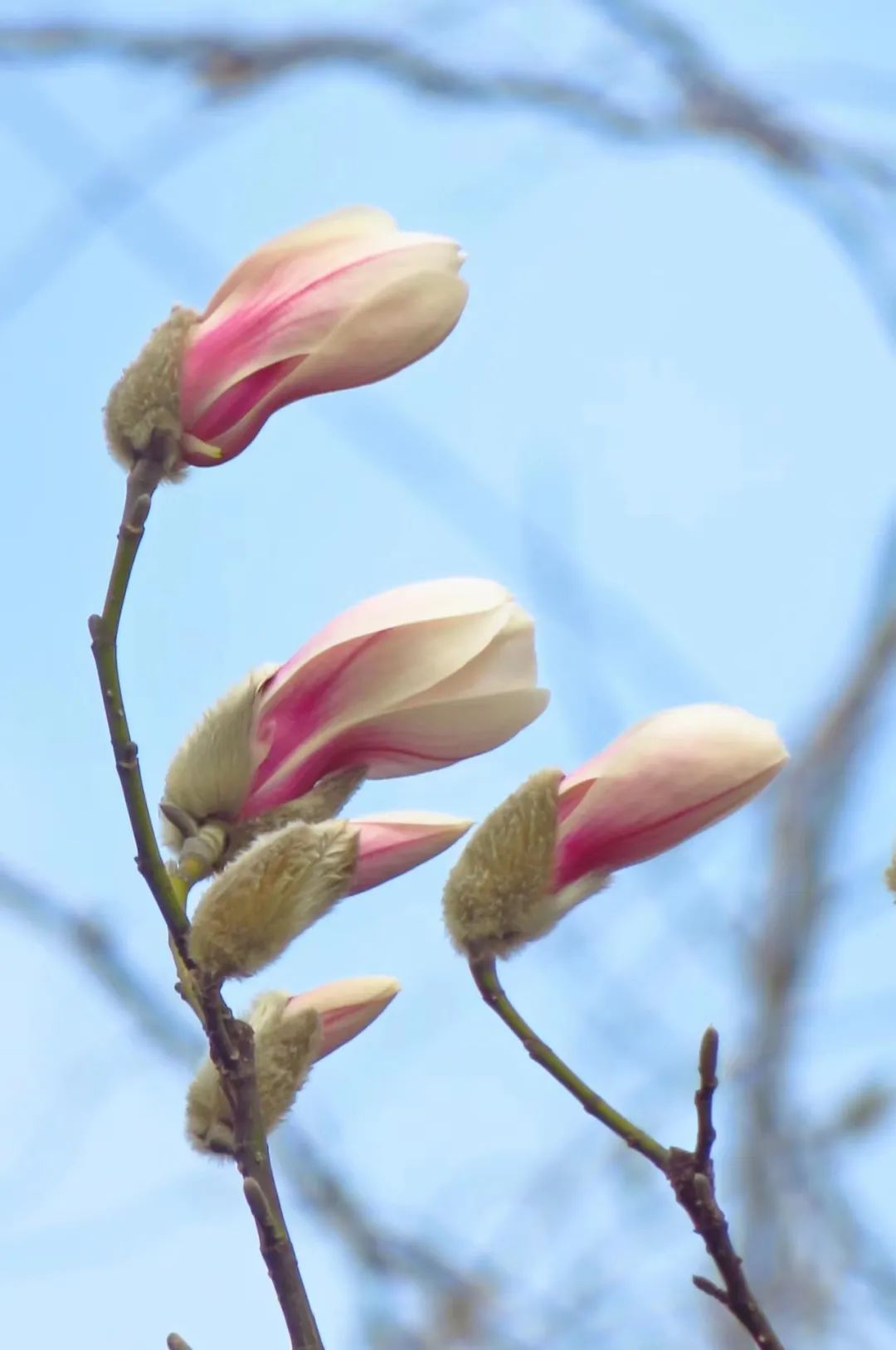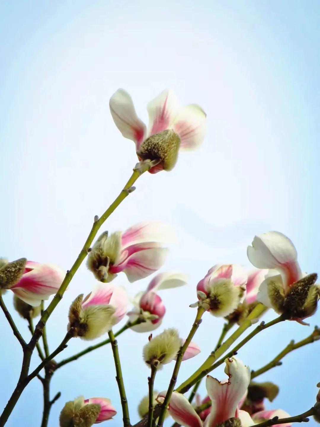 暖阳下的白玉兰,粉白的花瓣映衬着蓝天,格外好看。