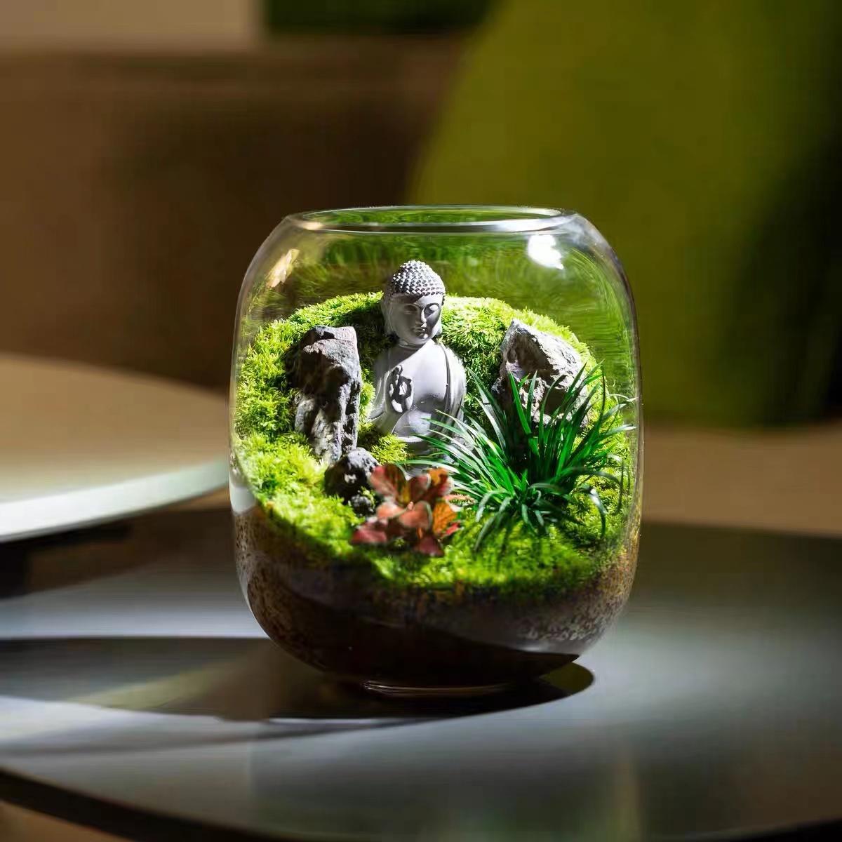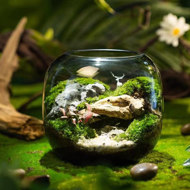 除此之外,桌面苔藓还有很多造景可以选择,在森林里遇见可爱小鹿,又或者干脆把池塘也搬到桌面上,也可以是瓶内花开见佛的禅意满满……在透明器皿中,装下一整个春意满满的远方,办公之余,护眼又养眼。