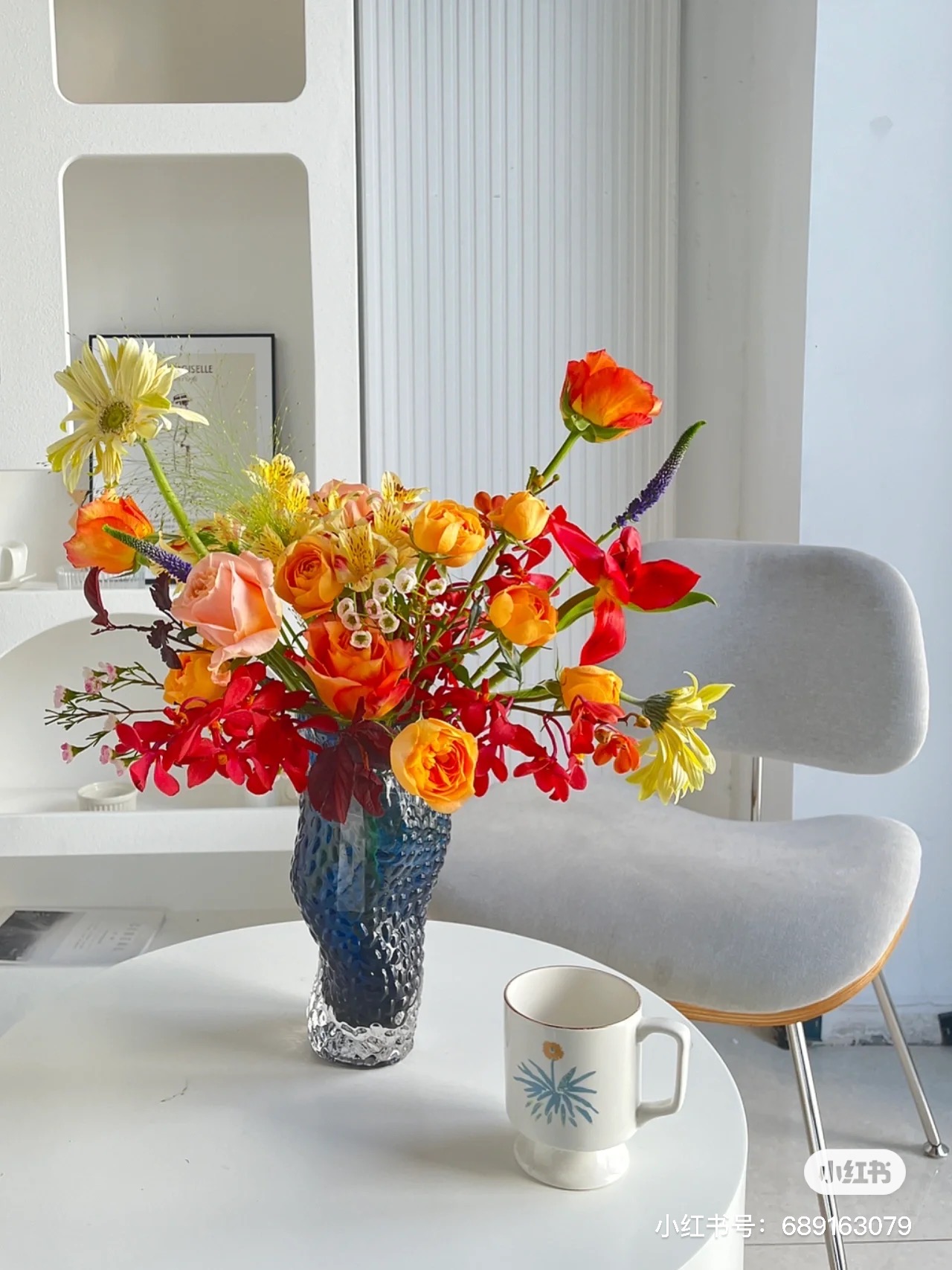 互补色:两种颜色在色环上呈180°,如黄色和紫色。除了考虑花与花之间的颜色以外,也可以把花瓶的色彩选择考虑在内,让花与容器成为一个整体,同样能够丰富视觉体验。