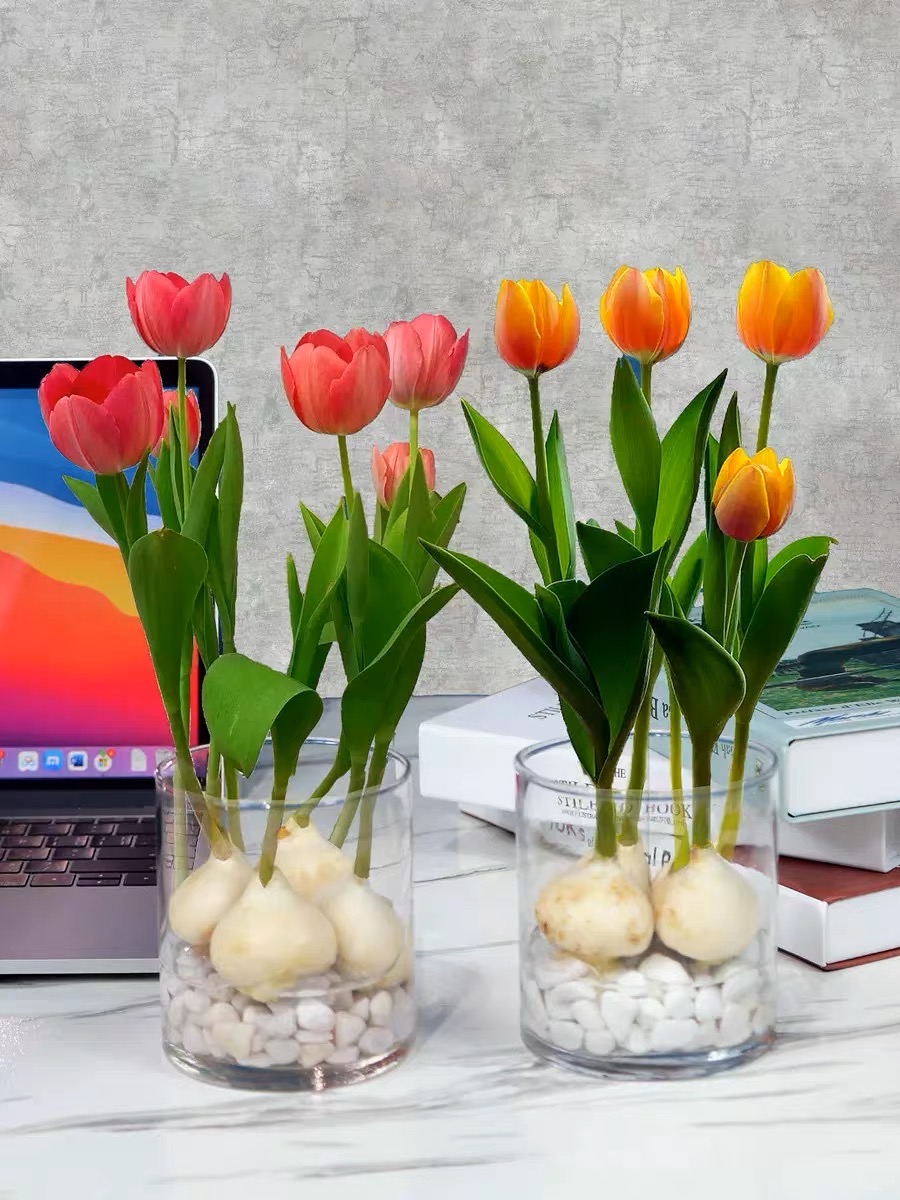 说到春日,除了绿叶以外,鲜花不能不提。郁金香可谓近日上海街头当之无愧的网红之一,他们的身影从武康大楼到徐家汇,从外滩再到杨浦滨江都可以找到,构成了上海春日的一抹亮色。这抹绚烂的春色如今也可以搬进办公室里,在玻璃器皿内水培就是方式之一。不过,水温需注意最好不要高于22°C。