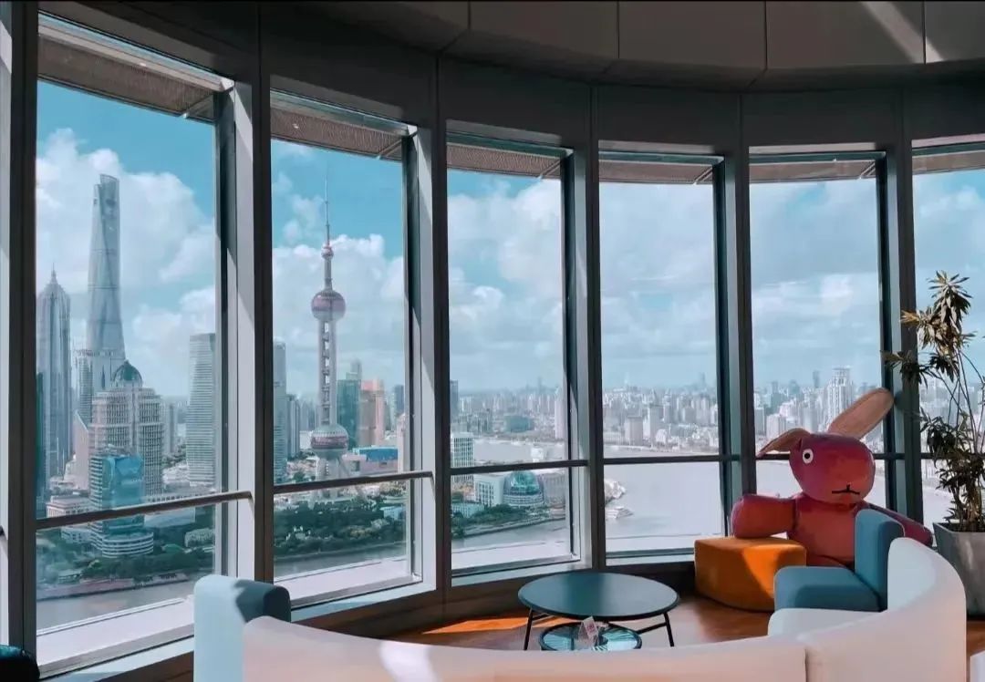 开放式的咖啡馆被环绕式落地窗包围,从窗边俯瞰,陆家嘴“三件套”与北外滩隔江而立,黄浦江两岸美景一览无余。
