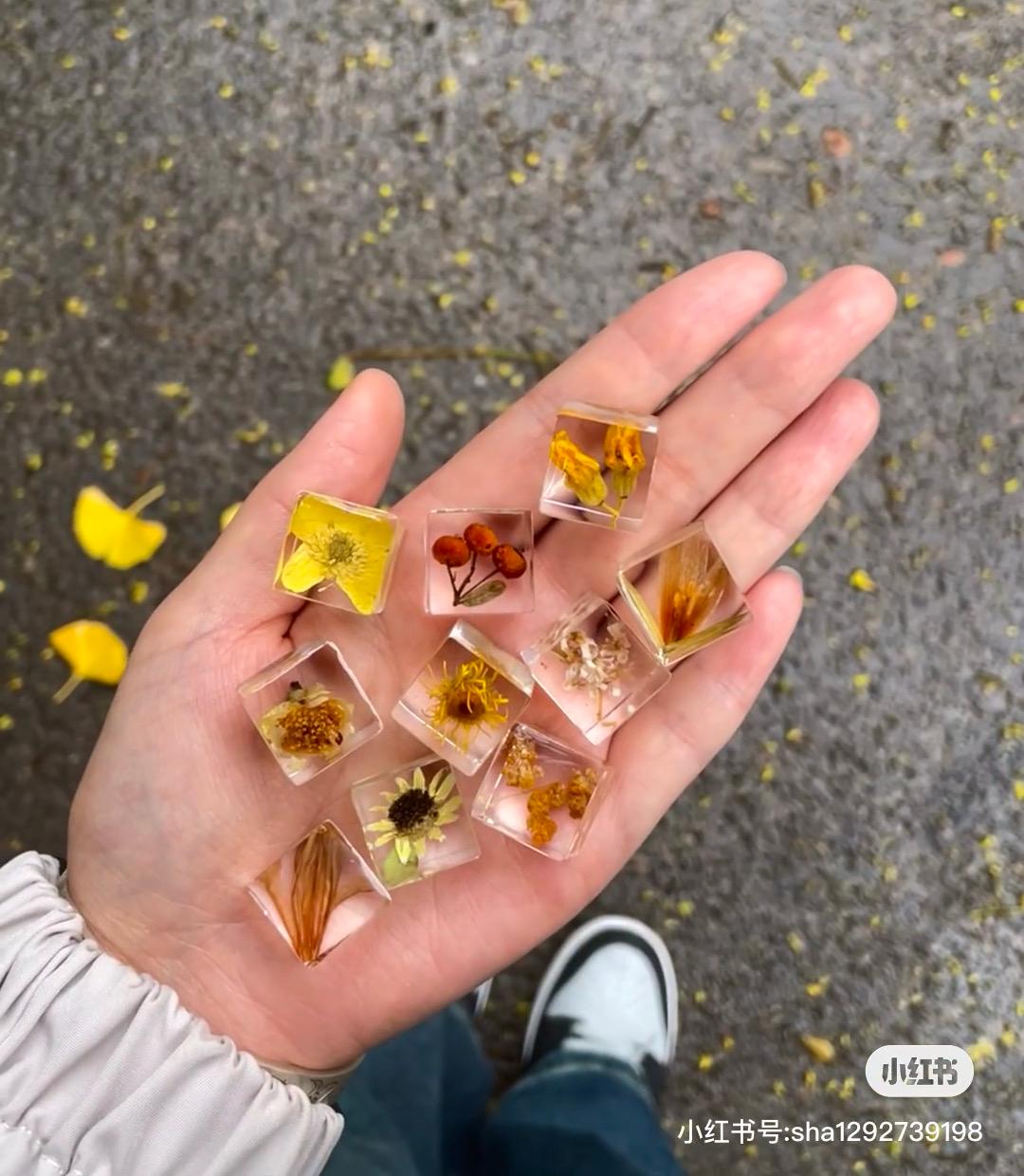 滴胶手作也是比较流行的工艺,树叶或者花朵捡回来后,可以用书压干,或者埋进干燥沙里做成干叶、干花,放进模具后滴入滴胶,等固定后脱模即可。
