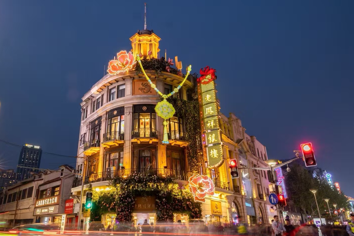 “鲜花妆上海,美饰荟申城。“花开新天地”为主题的2025上海国际花展于近日启动,以致力于构筑市民身边的打卡地、新优花卉的推广地、植物文化传播地的“花卉嘉年华”花展让市民的生活更加丰富多彩,为平淡的日子增添了一抹亮色。位于“中华第一街”南京东路的老凤祥银楼名品楼花团锦簇,金色招牌与缤纷花朵相互映衬,熠熠生辉。巨型“盛唐风华金项链”成为最大亮点,吸引往来行人驻足打卡。