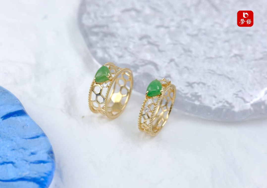心形、橄榄形的翡翠,恰似从宋画里走出的翠色精灵。那一抹浓郁翠色,是夏日山林间的清泉之色,温润而灵动,仿佛将整个盛夏的绿意都凝萃其中。翡翠之美,在于天然纹理与色泽,如同宋瓷开片般自然成趣,每一枚戒指上的翡翠,都是独一无二的存在,带着山川岁月的呼吸,轻触肌肤时,似有林间凉风拂过,驱散暑气。
