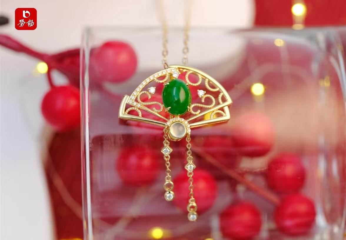 第三款挂件,承宋扇“玲珑扇面”之美,金色扇骨勾勒出流云纹样,椭圆翡翠如翠玉团扇的点睛之笔,下方流苏轻晃,钻石与金链交织如宋时织金,动静之间,是宋式美学“雅俗共赏”的生动诠释,让古典雅致落于颈间,处处皆有风情。