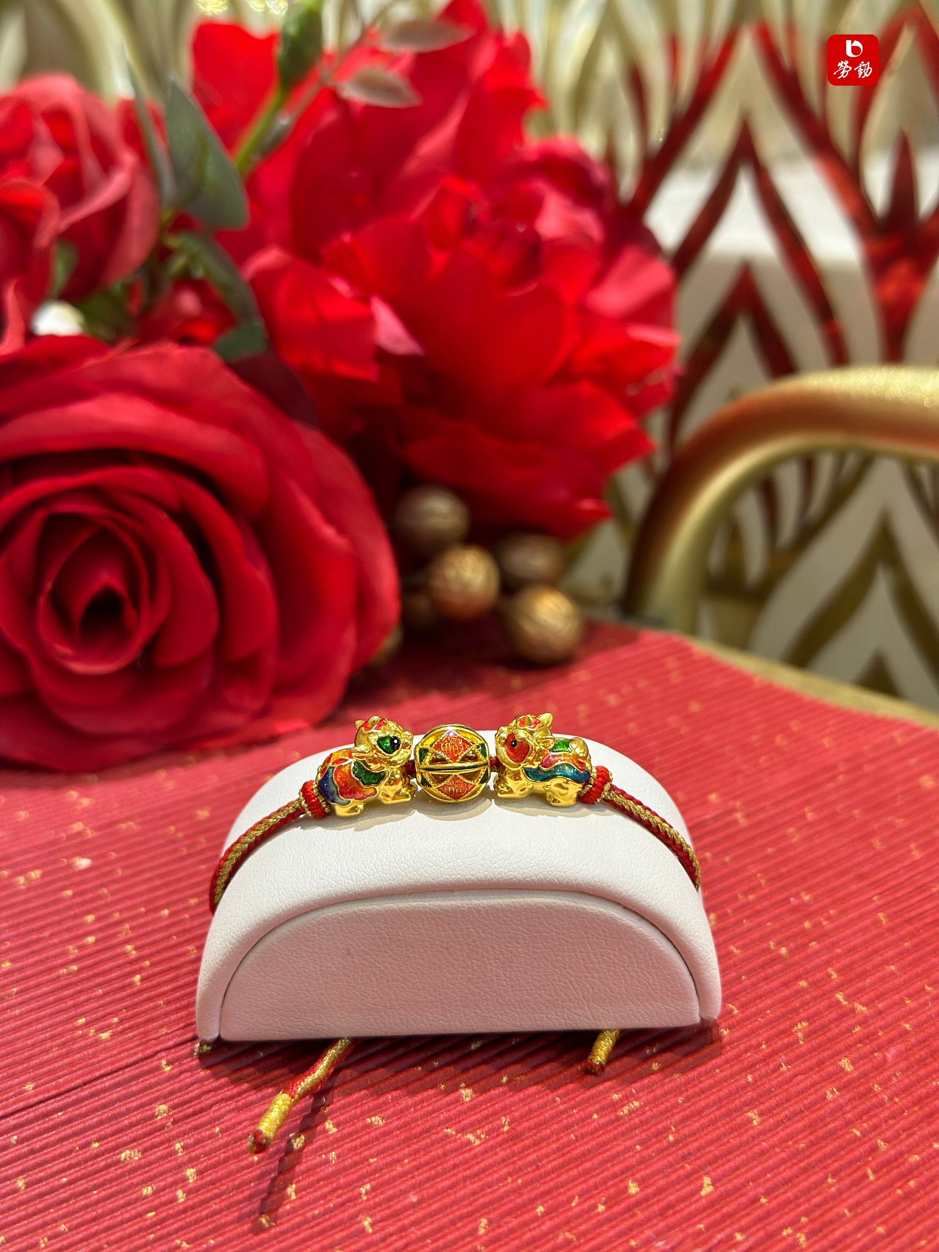第一款瑞兽红绳手链,以传统瑞兽为形,黄金工艺让瑞兽身披彩釉,如从古籍图腾中走来,红绳缠绕间是“辟邪纳福”的古老祈愿,戴于腕间,恰似将传统文化的守护力量系于身边,开学新程,无畏向前。