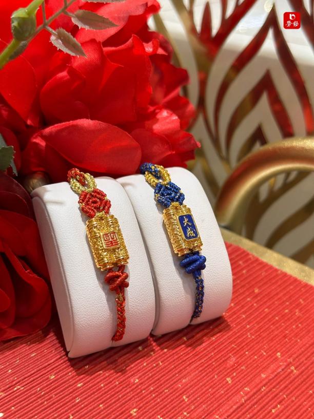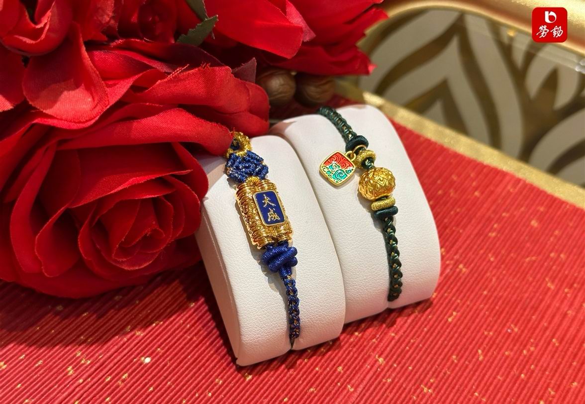 第三款“国潮双生”手链,红金款的“囍”韵与蓝金款的“大成”相映成趣,传统结艺与黄金工艺碰撞出别样火花,红绳热烈似青春朝气,蓝绳沉稳如学识积淀,两款叠戴或单佩,都是开学季里传统美学的个性宣言。