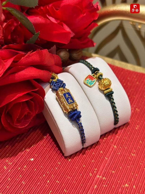 第二款“大成”蓝金手链,取“学业大成”的美好寓意,金色纹饰如传统建筑的雕梁画栋,蓝色“涛纹”红色“祥云”的珐琅方形饰品与圆形金珠构成的手链寓意“顺吉相伴,福运绵长”,蓝绳编织致密如学子求学的执着,这一抹腕间蓝金,是对学识精进的殷切期许,更是传统文字美学的生动表达。