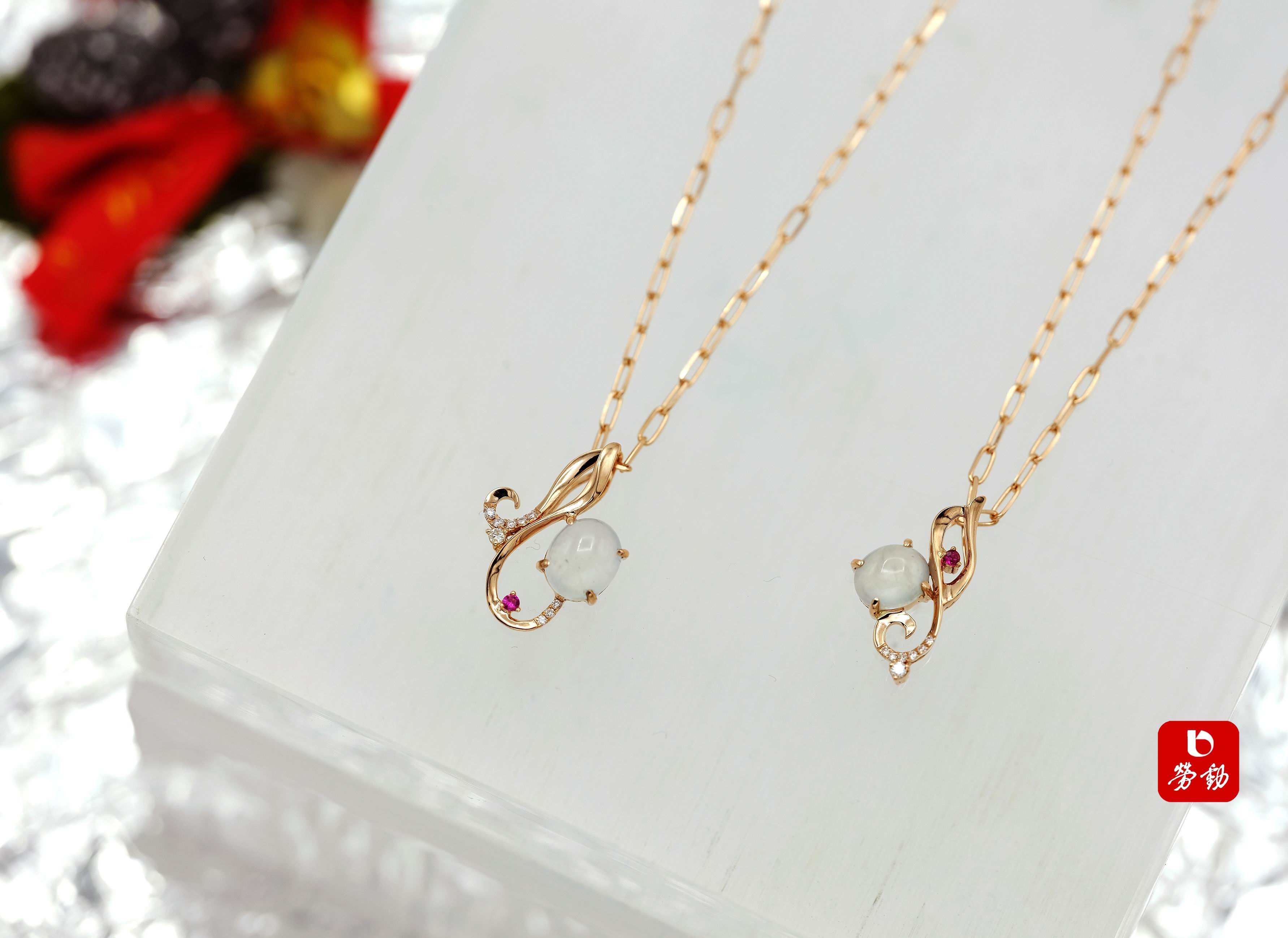 这枚音符,是年轻职场人的“轻熟系精致”:K金绞作流畅的符尾,像晨间地铁里晃着的耳机线,裹着的白翡润如刚冲好的燕麦拿铁,一点红宝石嵌在符头,是口红蹭在杯沿的轻艳,碎钻沿着链身铺成泛音,恰是敲键盘时指尖的光。穿通勤白衬衫,它是领口漏出的“不张扬的甜”;搭周末的针织开衫,它是咖啡杯旁晃着的“松弛感精致”——没有过重的华丽,只凭k金的暖、白翡的柔,衬出刚入职的青春底气。