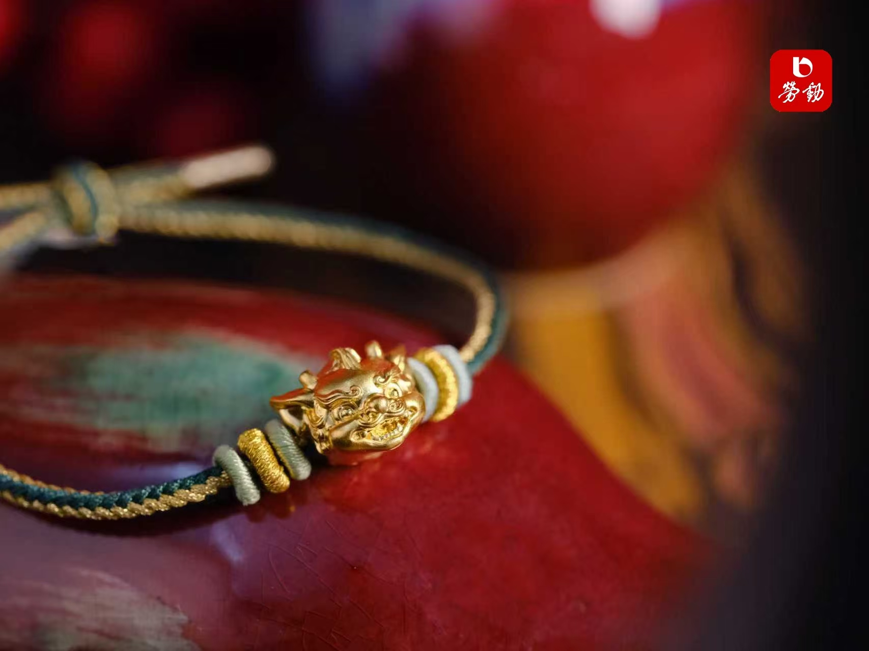 这让我想起老凤祥柜台上那些泛黄的旧账本,民国年间的女子会为女儿定制“瑞兽金饰”作嫁妆,在绢布包裹的金饰里,藏着“愿你一生明辨是非,不失初心”的嘱托。如今这枚谛听手链,依旧延续着这份心意:青绿绳线取“松竹之节”,暗合“守心若竹”的古意;金兽的纹路里,藏着敦煌壁画里“慈悲目”的弧度,仿佛在轻声问一句“你今日的心愿,是真愿吗?”