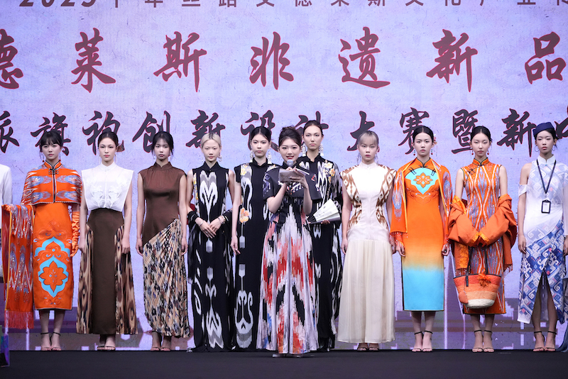 两周后,在金色胡杨环绕的叶尔羌河畔,一件件艾德莱斯新品在第六届新疆喀什丝路文化胡杨节暨莎车县“昆仑乐都·木卡姆艺术季”秀场上再次登场。海派旗袍的典雅剪裁与艾德莱斯的绚烂纹样相映生辉,将非遗时尚从黄浦江畔带回了丝路源头,形成了沪喀两地深情的文化呼应。