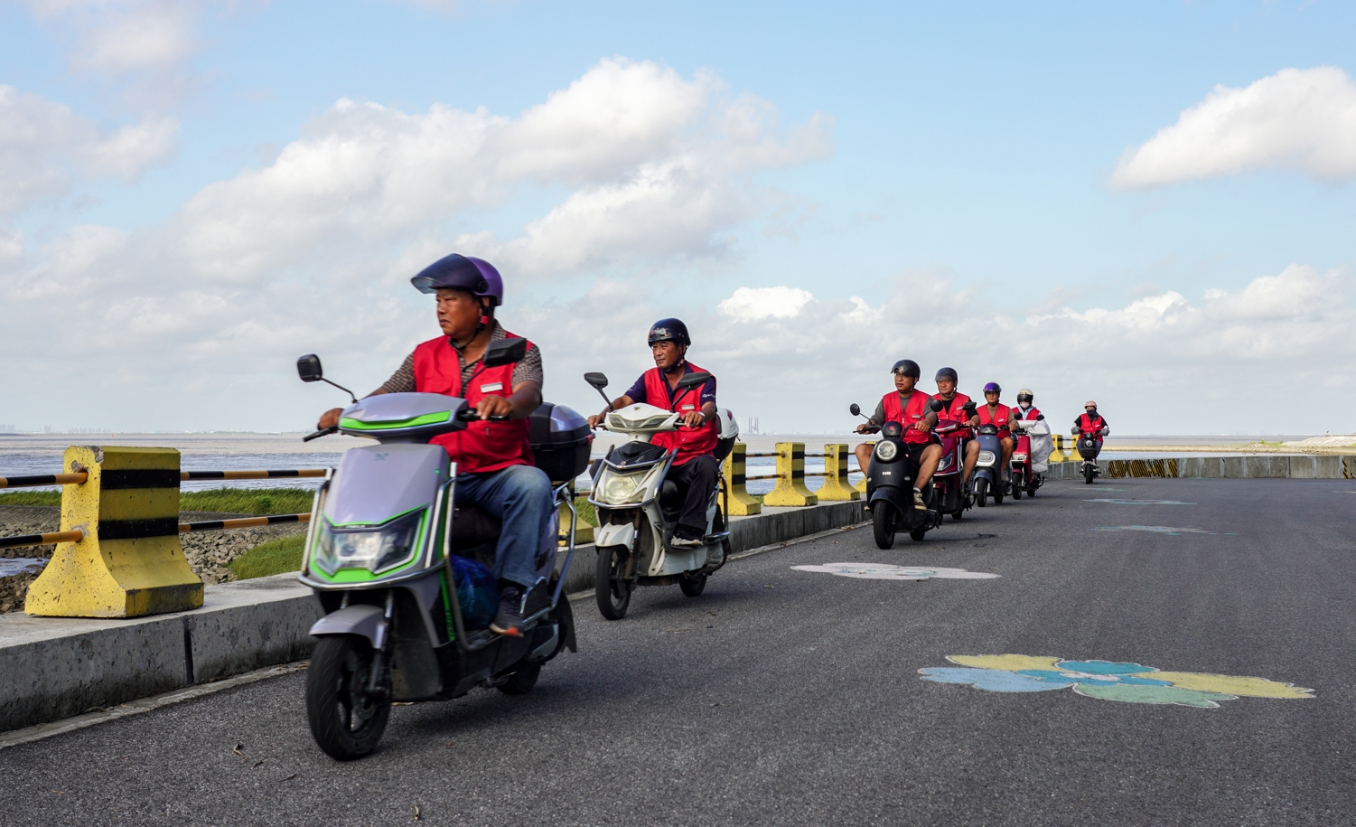 时针划过7时,一群身穿红马甲的堡镇禁捕巡查员,骑着电动车准时出现在了江堤,开始了一天的巡查。