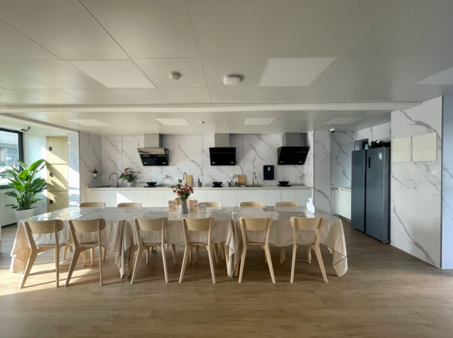 社区5号楼专门规划了250平米的共享生活区,其中,共享厨房有六个灶头可同时使用,中间的桌椅让烹饪后的聚餐格外热闹,墙上的照片记录着新年时大家一起包饺子的团圆场景。共享洗衣房里的滚筒洗衣机与烘干机,解决了租户洗衣晾晒的难题,带私密性的电话间更方便租户与远方家人通话而不打扰室友。