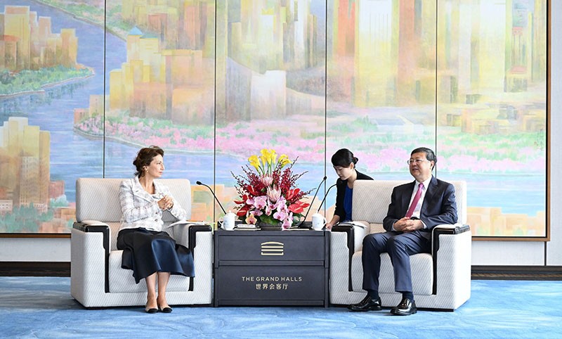 中国常驻联合国教科文组织大使衔代表杨新育,上海市领导华源、解冬参加会见。