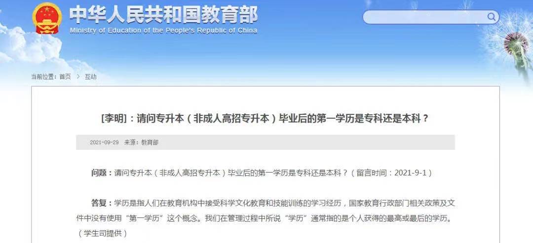 近日,教育部针对网友提问“专升本(非成人高招专升本)毕业后的第一学历是专科还是本科”进行答复。