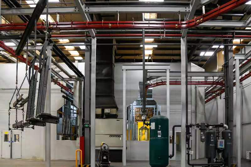 焊接完成的车身、门驾等部件,在被归类进物料仓库后,又会根据订单通过仓库被送到涂装车间。而一块原本带着钢铁原色的部件,进了这里,就要经历抛丸、水洗、喷漆、烘干等至少4道工序,其中抛丸、喷漆一开始完全依赖于人工。如今,抛丸线已实现全自动,喷漆线则有两台机器人协作,可实现复杂产品、四种颜色的全自动喷漆。
