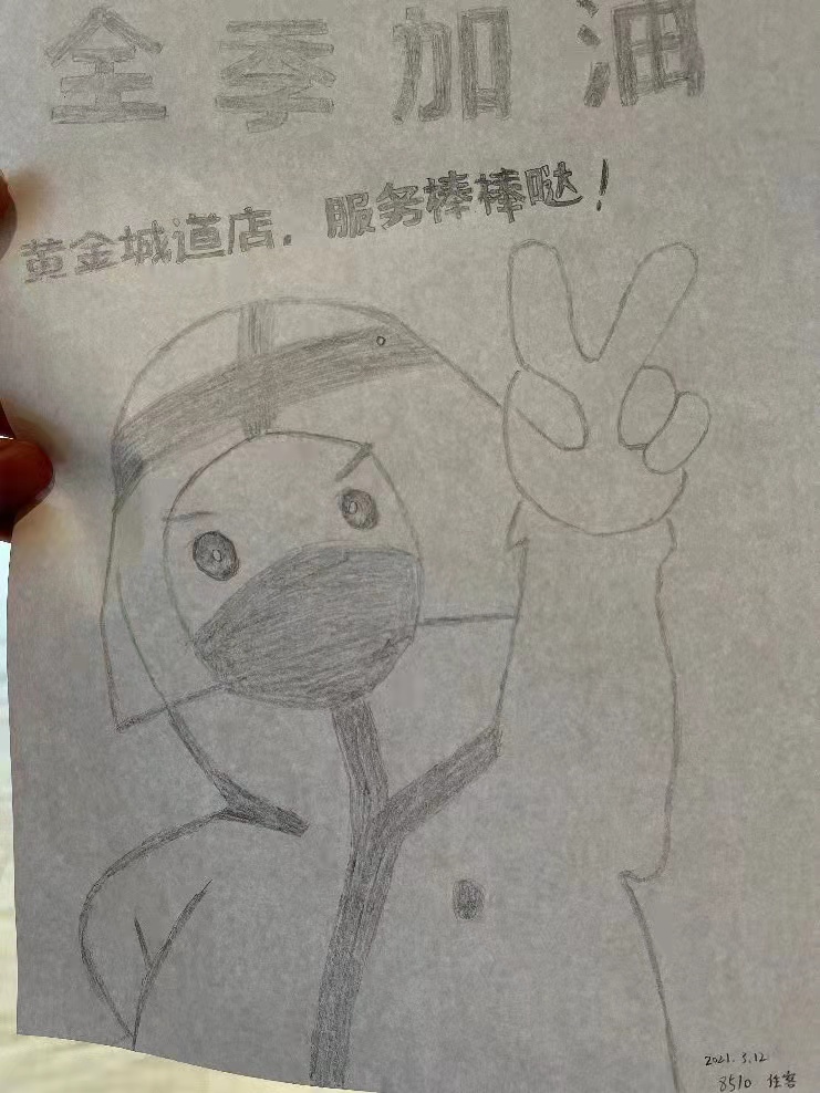 3月17日,在解除隔离时,这位爸爸将小女孩手绘的一幅作品交到了我们手上。
