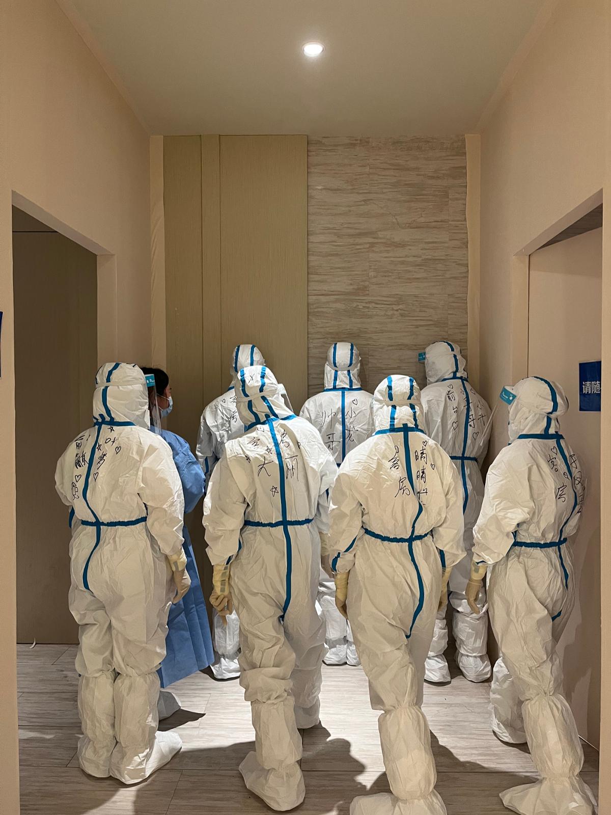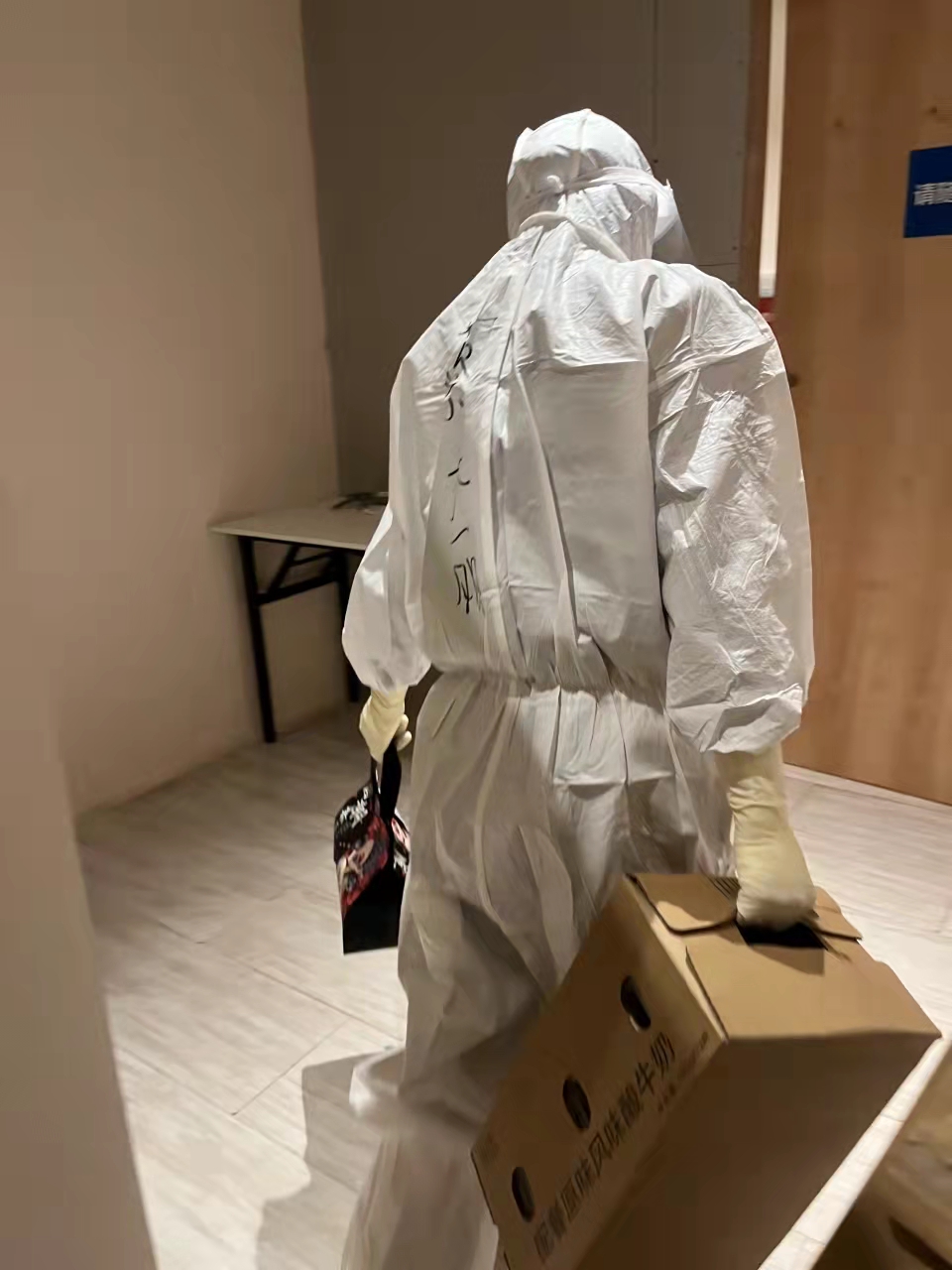 午餐后,开始整理客人网购的商品,一一送去物资。14点,开现场工作会议,听听大家遇到什么情况,讨论如何优化流程。然后,我们还要定时培训防护服穿脱知识,我也要抽查监控,看看大家操作流程是不是规范。这样一忙,就又到了5点,要开始准备晚餐的配送了。
