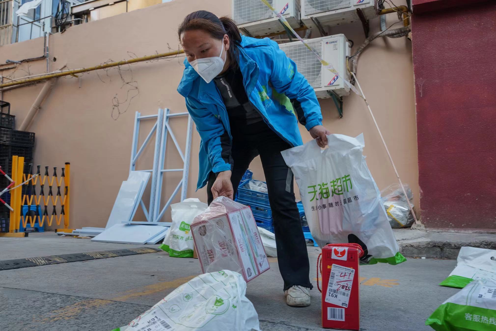 李小雨在上海负责天猫超市的包裹配送,送的都是民生物资。