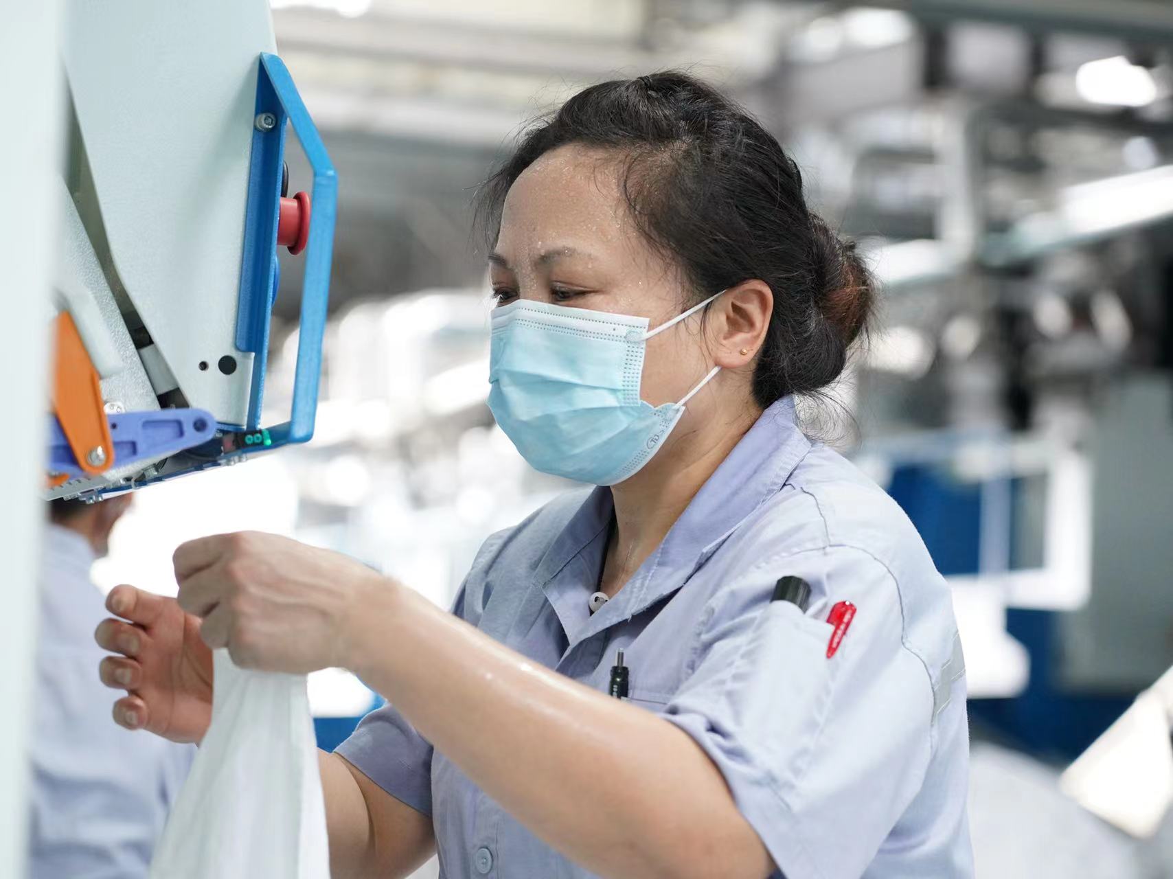 每次熨平作业后,金梅华和同事们还要复检一遍。一天下来,从熨平机到后台,身上湿了干、干了再湿。记者跟了近半个小时,人已经像从水里捞上来的一样。金梅华介绍,她和工友平均每天“补水”4公斤左右,基本是常人摄入量的1倍还多。