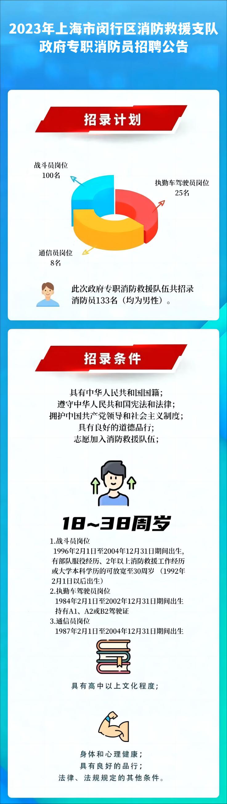 有志于从事消防员的年轻人注意了,上海市闵行区消防救援支队面向社会公开招聘133名政府专职消防员(18至38周岁,具有高中或同等及以上学历),其中,战斗员岗位100名、执勤车驾驶员岗位25名、通信员8名。据悉,2月19日16时报名截止,距离现在仅剩五天。报名网站为上海市消防救援总队网站